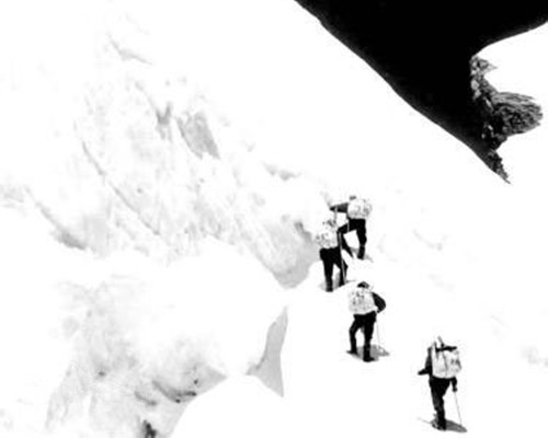 他们看到自己攀登顶峰时在雪上留下的脚印,二十五岁的四川林业工人屈银华立即把它摄入了电影镜头——这将是纪录这次伟大登山事迹的影片中,最宝贵的画面之一。