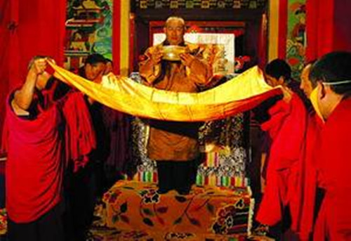 被迎进寺院的灵童,要由高僧为其剪发、换僧衣,并给灵童授戒取法名。授戒取法名后,寺院还要为灵童剃度取名举行盛大庆典。待选定良辰吉日,便举行坐床仪式。