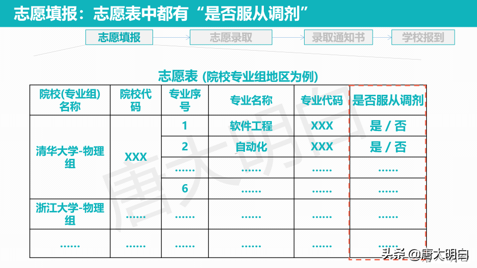 高考填报志愿的过程中,大家经常会听到一个词汇,就是“专业调剂”或“专业服从”。在考生的志愿填报表格上,志愿栏的最后一列一般都有“是否服从调剂”,如下图。什么是专业调剂,它的影响是什么?下面唐大明白简单说明一下。