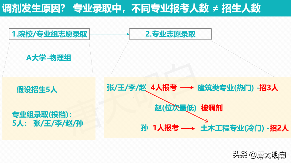 例如下面的案例,假设有5个同学在录取第一阶段被成功投档某个院校或专业组,在第二阶段专业录取中,假设有二个专业招生专业,其中建筑类招生3人,但5人中有4人报考,结果是4人中位次最低的赵同学录取失败。他如果服从专业调剂,就会被调剂到该院校或该专业组下的土木工程专业,这就是专业调剂发生的原因。