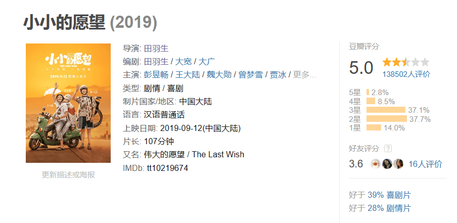 当然也可以理解,在脱离了《前任》系列后,田羽生后来也拍了一部轻喜剧《小小的愿望》,票房却并没有达到此前《前任3》的高度,豆瓣评分仅仅5.0,此后田羽生与另外4位导演合作的抗疫题材电影《你是的我春天》,只拿到了3000万票房,所以田羽生或许也想要凭借《前任4》再度证明自己。