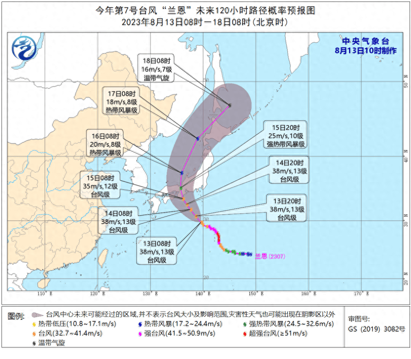 预计,“兰恩”将以每小时10-15公里的速度向西北方向移动,强度变化不大,并逐渐向日本本州岛南部沿海靠近。