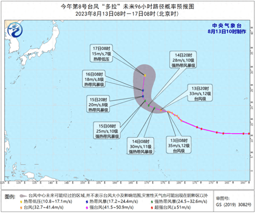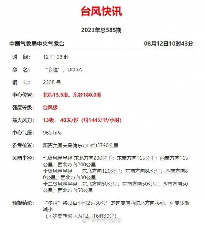 今年第8号台风“多拉”(DORA)(台风级)的中心13日上午8点钟位于美国关岛偏东方向约3350公里的西北太平洋洋面上,就是北纬18.1度、东经175.8度,中心附近最大风力有12级(35米/秒),中心最低气压为970百帕,七级风圈半径165-200公里,十级风圈半径80-120公里,十二级风圈半径50公里。