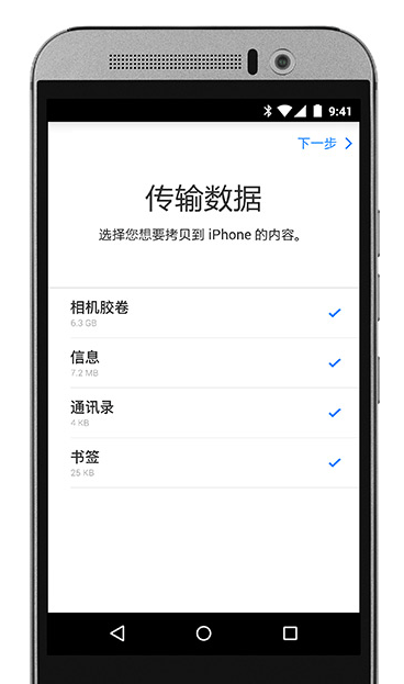 可转移内容:通讯录、信息、相册、大部分 的APP、手机便签、备忘录(印象笔记、浏览器收藏记录等等)可以一次性进行转移。