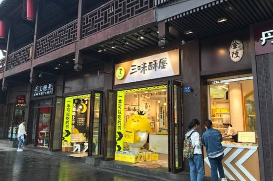 三位酥屋在古朴的夫子庙十分醒目,白墙黑瓦中以其独特鲜亮的黄色调装潢为街道增添更多的色彩,店内的烘焙间采用透明的开放式,让消费者既能品尝新鲜出炉的酥点,又能欣赏酥点的制作工艺,是南京成独一无二的酥点店铺。