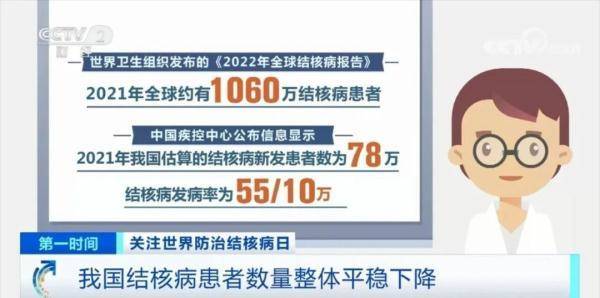 结核病是一种常见的、危害健康的传染性疾病。世界卫生组织发布的《2022年全球结核病报告》显示,2021年全球约有1060万结核病患者,中国疾控中心公布信息显示,2021年我国估算的结核病新发患者数为78万,结核病发病率为55/100000。近年来,国家加大了普及结核病防治知识的宣传工作,动员全社会行动起来预防和控制结核病。