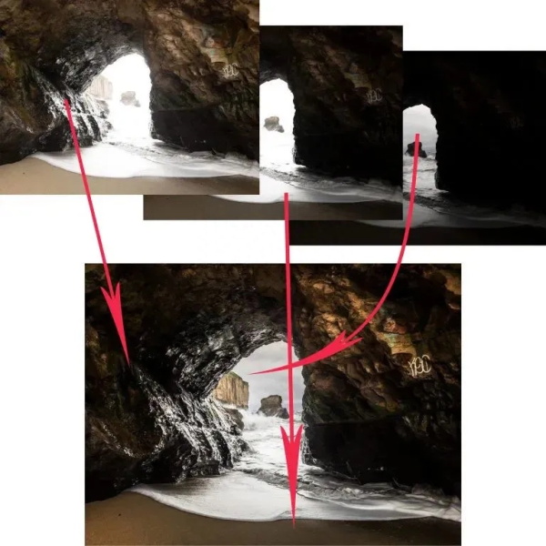 过曝的照片取暗处—细节丰富,正常曝光的取中间调,欠曝的照片取亮的地方—细节丰富,最后合成一张曝光正常的照片。