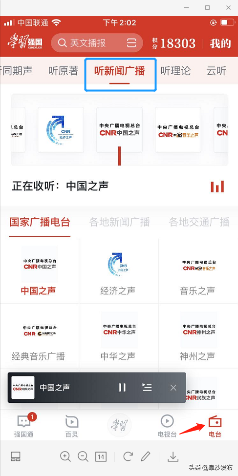 打开学习强国APP,点击底部“电台”栏目,再点击上方“听新闻广播”频道,如图: