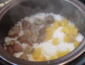 这个板栗菠萝饭做起来炒简单,就是把米放电饭锅中,加适量的水,这个米不是很吃水,一般两杯米加两杯半水是刚刚好。然后加入板栗和菠萝丁,蒸熟就可以吃啦,米的自然香味,连板栗和菠萝的味道都无法掩盖哦,入口依然可以品尝到米的香味。