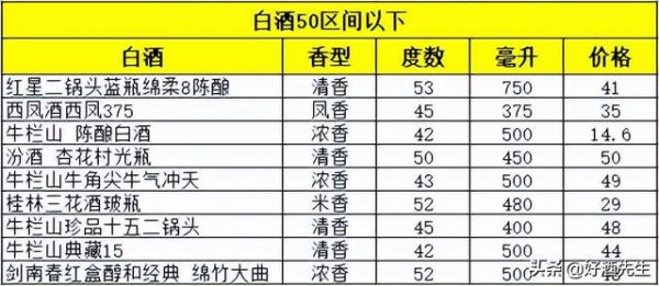 50元以下区间,除桂林三花酒外,红星二锅头蓝瓶绵柔8陈酿、西凤酒西凤375、牛栏山陈酿白酒、汾酒杏花村光瓶、牛栏山牛角尖牛气冲天、牛栏山珍品十五二锅头、牛栏山典藏15、剑南春红盒醇和经典绵竹大曲等也榜上有名。