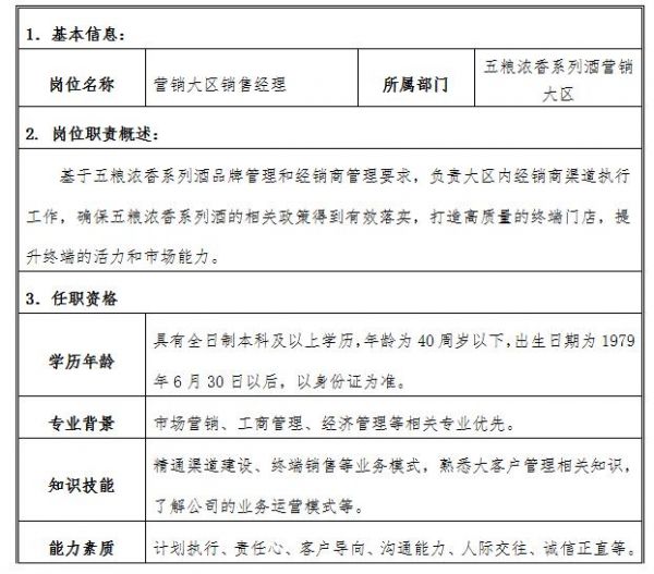 根据五粮浓香系列酒有限公司的发展规划,为更好地服务于市场和经销商,满足消费者对于美好生活的追求,特面向社会公开招聘一批营销大区销售经理,现将具体情况公告如下: