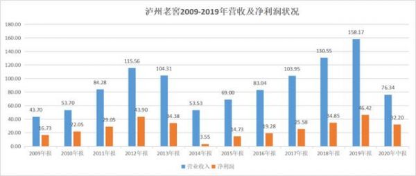 2009年,泸州老窖股份有限公司(以下简称「泸州老窖厂」)全年营业收入43.7亿;至2019年,泸州老窖厂全年营业收入已达158.17亿,11年翻了近4番。