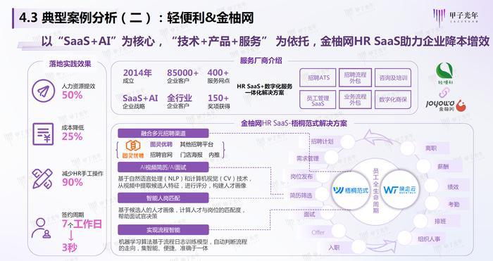 金柚网正是在观势的基础上打造Al助力的HR SaaS和数字化服务一体化解决方案,包括具有招聘能力的服务型HR SaaS+AI新产品「梧桐范式」和员工全生命周期管理能力的「唤企云」,以“SaaS+AI提升业务效率,以数字化人力资源服务保证业务效果”的理念,为企业提供人才招聘与用工管理的一站式解决方案。