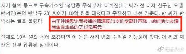 而这笔钱是她前男友曝出来的具体数字,当李熙真因诈骗罪被抓后,他指控潘南奎趁乱卷跑了10亿韩元(约585万人民币),但证据不足没告成功。