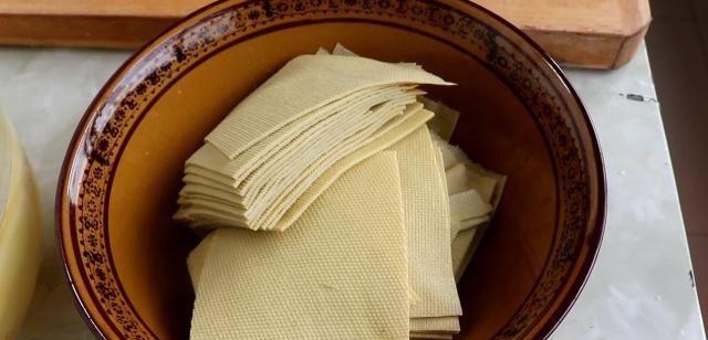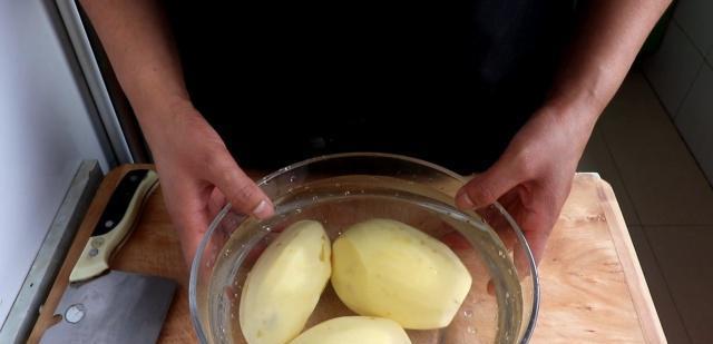 面团揉好后盖住让它发酵到原来的2倍大2、在发酵面团的时间里,准备3个削皮洗干净的土豆,然后把土豆全部切成薄片。准备几张洗干净的豆腐皮,切成大小相同的片