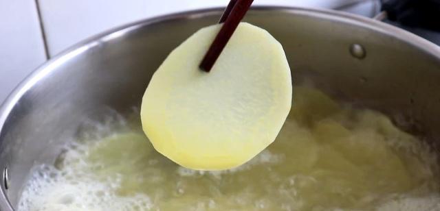 煮的时候往里面加入盐,再加点醋进去,这样煮好的土豆片才更容易入味,口感才会脆爽。一直煮到土豆片颜色变成透明状的时候就熟了,捞出来过凉水备用