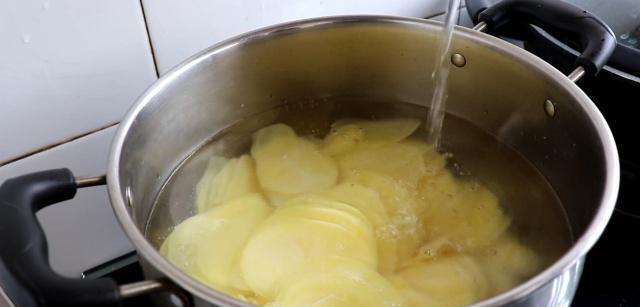3、锅里水烧开后,把土豆片倒进去煮一下。