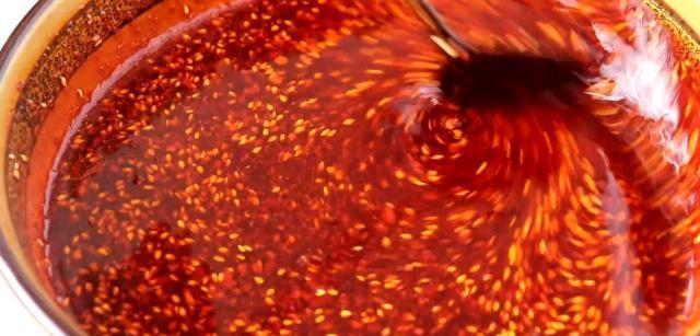 再把热油倒入辣椒面碗里,边倒边搅拌。然后往里面加入少许的香醋,这样做的油泼辣子的味道才会更香。