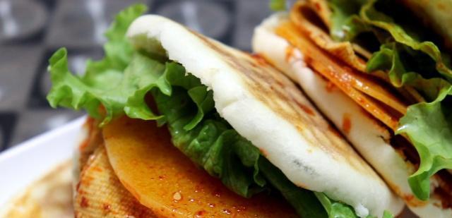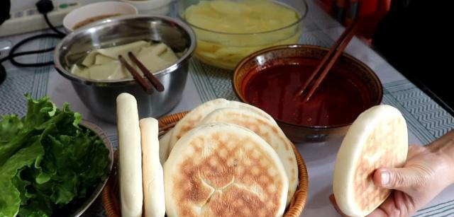 饼子、土豆片、豆腐皮、生菜,还有最重要的辣椒酱。把土豆片在辣椒酱里蘸一蘸夹到饼里面,豆腐皮也蘸上酱料,再加上生菜就可以开吃了
