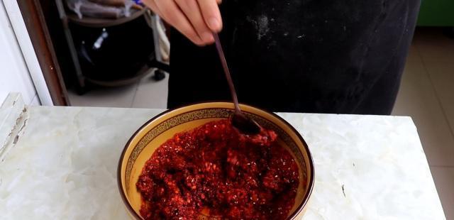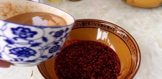 咱们这个油泼辣子就做好了5、接下来拌土豆片夹馍里面的辣椒酱。另取个空碗,把刚才的油泼辣子往空碗里倒一少部分,然后里面加入一部分芝麻酱和少量开水搅匀。