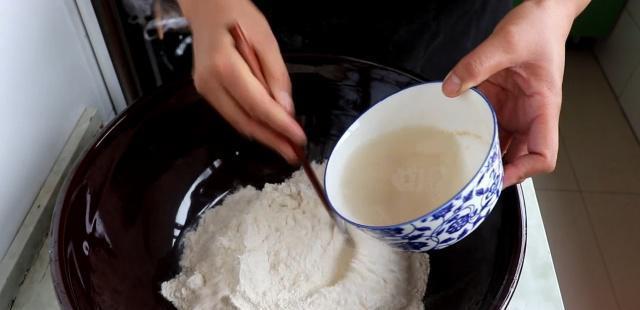 边倒入酵母水,边用筷子搅拌。再往里面加入温水和面,一直搅到里面没有干面粉,再把它们揉成面团。