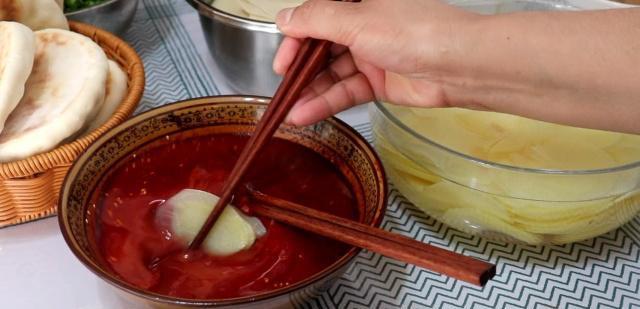 土豆片往辣椒酱里一蘸,火红火红的,看着都觉得辣,不过陕西人最爱吃的就是辣。越辣越喜欢,越辣越过瘾。