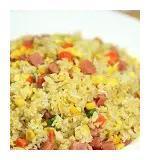 食材:500g米饭、2个鸡蛋、250g火腿肠、50g青豆、50g玉米、50g胡萝卜、适量盐、适量蚝油、适量香油