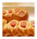 食材:110克高粉、2克酵母粉、40克低粉、15克糖、1/4小匙盐、70克水、1个蛋黄、15克黄油、2根火腿肠
