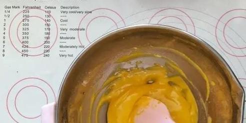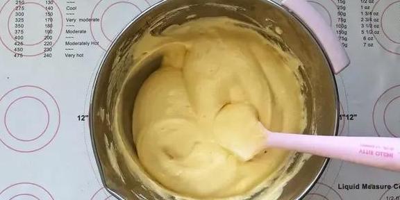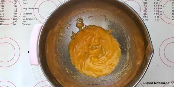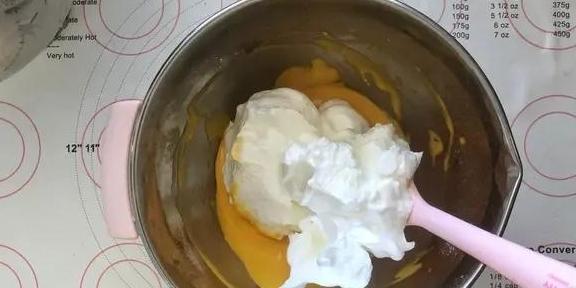 步骤六、把打好的蛋白分两次倒入南瓜泥中,用铲子稍微翻动几下(注意不能快速搅动,容易稀释),倒入提前准备好的模具中(模具底部要放些油,这样后期倒出来不会粘底)