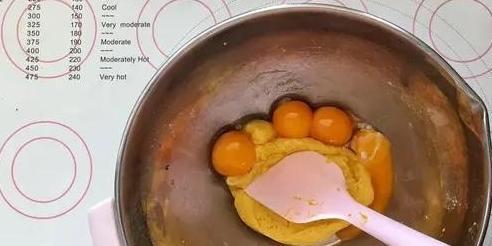 步骤三、然后把准备好的鸡蛋拿出来,把蛋清和蛋黄分离(注意这一步不要把蛋黄碰烂),再把分离出来的蛋黄,倒入南瓜中继续搅拌