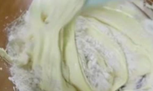等到面粉过筛好以后,就可以把过筛好的面粉加入到鸡蛋糊里边了,再加入面糊以后一定要用翻拌的手法搅拌均匀而且加班出来的面糊也是有一定的粘稠度的。