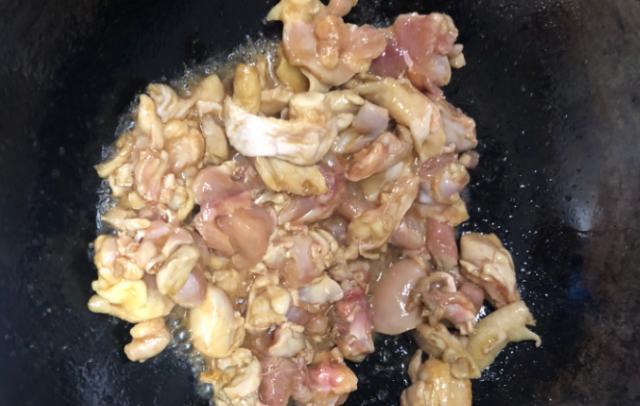 起锅烧油热锅,凉油把冰糖放入到锅里边,小火熬着,等到冰糖大泡变小泡的时候,我们就可以把准备好的鸡腿肉放进锅里面。