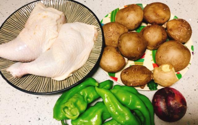 首先我们需要准备好所有的食材,鸡腿两个,青椒适量,香菇适量,洋葱一个,姜一块,冰糖两小块,生抽两勺,老抽一勺,料酒两勺,蚝油两勺。
