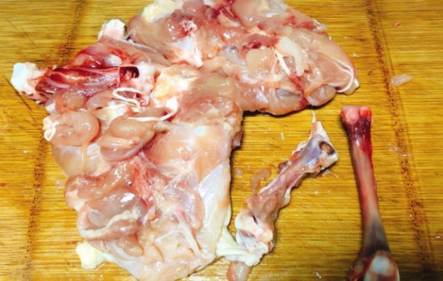 这样的方法踢出来的鸡肉还是非常干净的,最后切成小块。