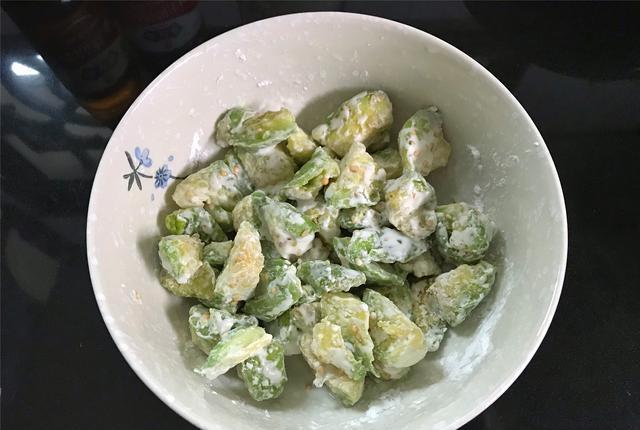 3、把腌好的茄子挤干水分,加入玉米淀粉,让每一块茄子都裹上淀粉。