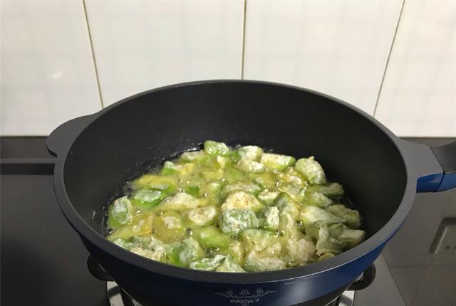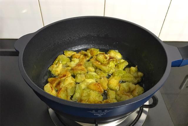 5、中小火,炸的时候用筷子把粘连在一起的茄块打散,炸至茄子表面呈金黄色时捞出控油。