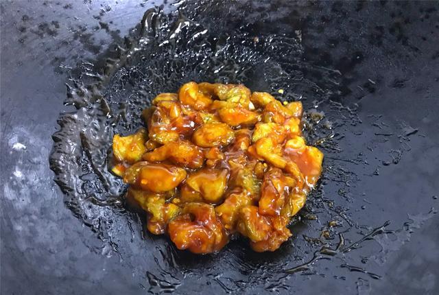 9、把炸好的茄子放入锅中快速地用锅铲翻拌均匀,让每块茄子都裹上糖醋汁。
