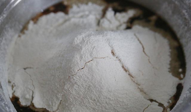 2、木薯粉过筛然后加入水中,然后再把高筋面粉也过筛再加入进去。