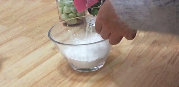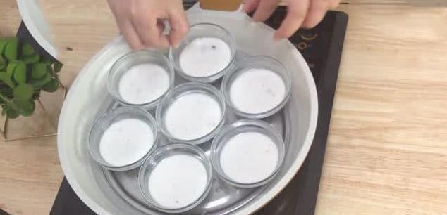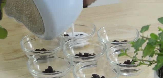 我们提前调一些糖水,然后再把烫水和这些粉蕉,都倒在一起搅拌均匀,然后我们就要准备出比较少的碗或者是其它的模具,我们现在这个模具或者是碗的底部加一些葡萄干,桂花或者是蜜红豆,接下来就要把刚刚调制好的加了烫水的粉浆,慢慢的倒进这些碗里面,大家不要倒得太满。