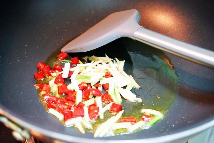 步骤五:油温六成的时候把切好的辣椒段、葱丝和姜片都放到锅中开始翻炒,要让这些食材的香味给充分的爆炒出来,这是非常关键的,如果是没有让这些调味料的香味炒出来,那么做出来的花蛤味道就不会很好,甚至还会有腥气味。