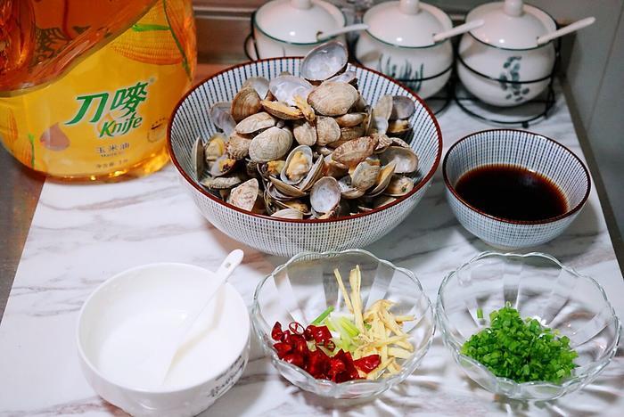 配料:花蛤2斤,姜一块,干辣椒3个,香葱3根,料酒一勺,蚝油一勺,生抽一勺,糖一勺。