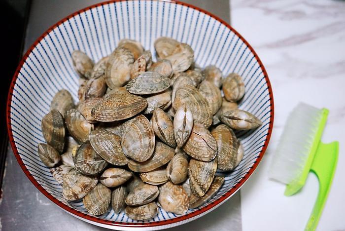 步骤二:花蛤要先放到清水中浸泡,然后让花蛤充分的吐沙,这样才能够冲洗的干净,要不然不光是会影响到口感,还会让身体健康出现问题,花蛤吐沙之后再认真的用刷子清洗一下。