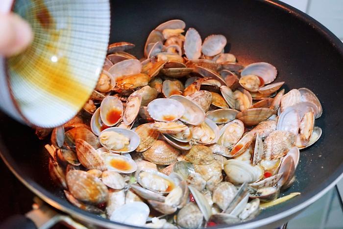 步骤六:放花蛤进去翻炒,同时放一勺料酒进去爆香,让香味更浓,这样能够更好的遮挡住花蛤的腥气味。
