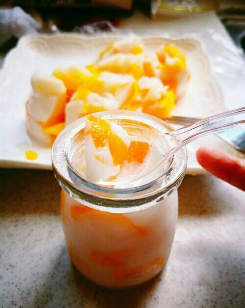 步骤三也可以准备几个布丁杯,小编还有之前做布丁的时候留下的杯子,就把果肉都放在里面了。这种小杯子真的很好看。