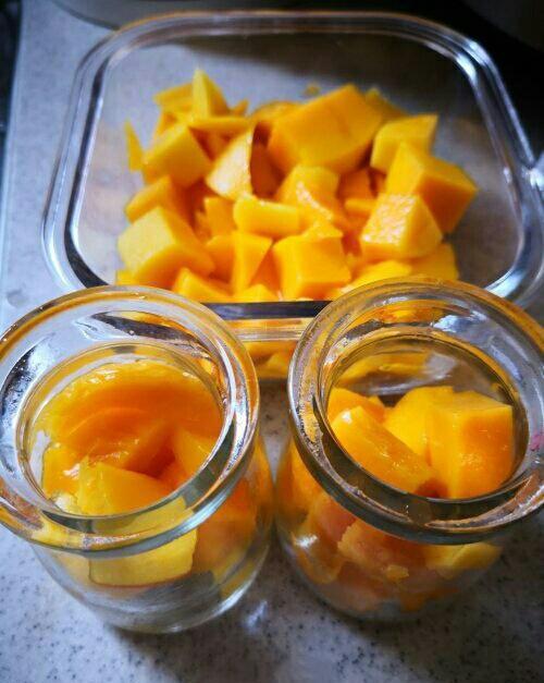 步骤九最后再把布丁杯和保鲜盒的芒果椰奶冻,放到冰箱中,冷冻半小时,冷藏一小时左右,我们的芒果椰奶冻就完成了。