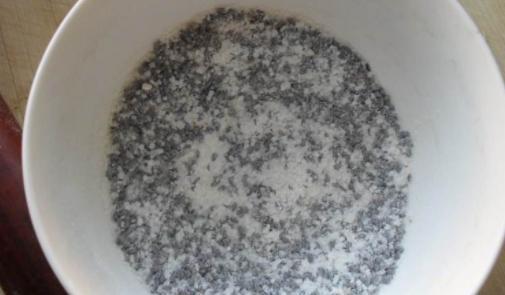 然后我们准备一个小碗,在小碗里边加入一些白砂糖之后,再加入少许的面粉,然后再加入一些黑芝麻,充分的搅拌均匀,加入了一些面粉以后,做出来的螃蟹在吃的时候也不会流出来,而且口感吃起来也不会太甜,等到搅拌均匀以后先放在一旁备用,然后我们再另外准备一个碗,在碗里边加入适量的面粉之后,再加入一些热油,充分的搅拌均匀做成油酥。