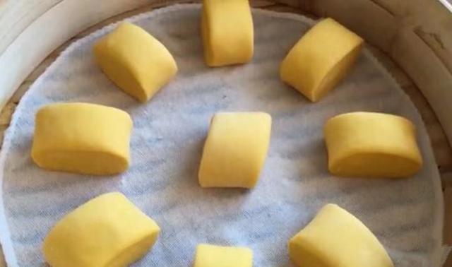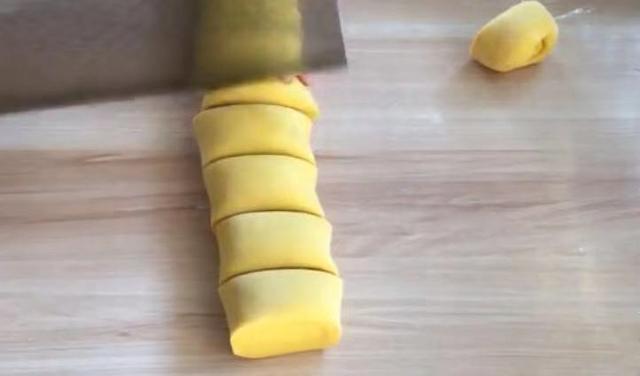 南瓜馒头3、把揉好的面团搓成长条,再切成刀切馒头状,切好之后把馒头整理直了,这样蒸出来的馒头才不会东倒西歪,把笼布打湿,放在笼屉内蒸好,把馒头都留好空隙摆放好。