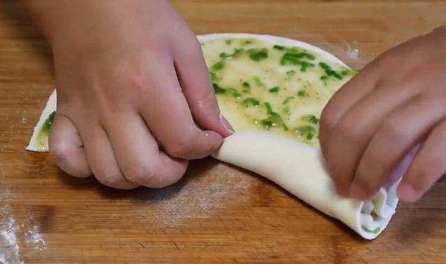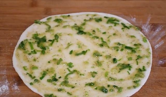 葱花油饼3、把面团取出来搓成长条,切成相等的面剂子,取一个面剂子用手压扁,擀成一张圆形的饼皮,舀入一勺油酥,充分涂抹均匀。油酥是饼层次丰富的关键,沿着半径处切上一刀,从一边卷起来。最好把收口处捏紧实,防止油酥流出,捏住两端反方向拧一下,可以增加饼的层次,放在面板上用手压扁,借助擀面杖擀大擀薄,擀成圆饼。