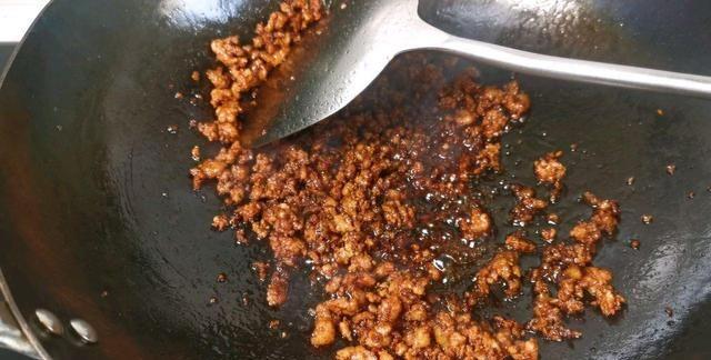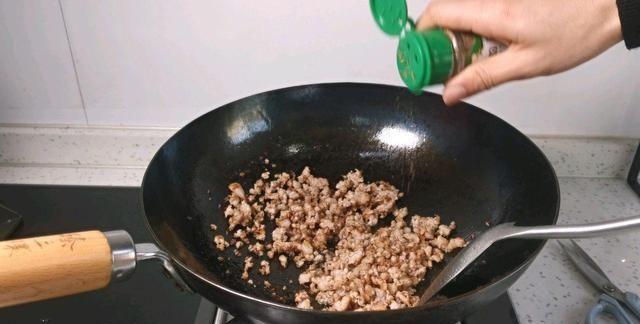 5.在蒸鸡蛋糕的时候,在另起一口锅咱们来炒肉末,这个肉末我买的现成的,如果大家想要自己剁也是可以,锅中放少量油,等油温上来后将肉沫放进锅中炒香,等肉末已经变色了,加入适量的五香粉。