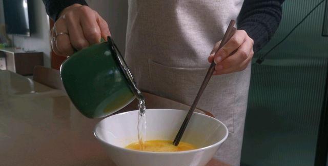 2.鸡蛋搅拌均匀后,准备出一杯凉白开,水的量是鸡蛋的1.5倍~两倍,不过最终还是要看鸡蛋的稀稠度进行添加,如果太稀也不怎么好。